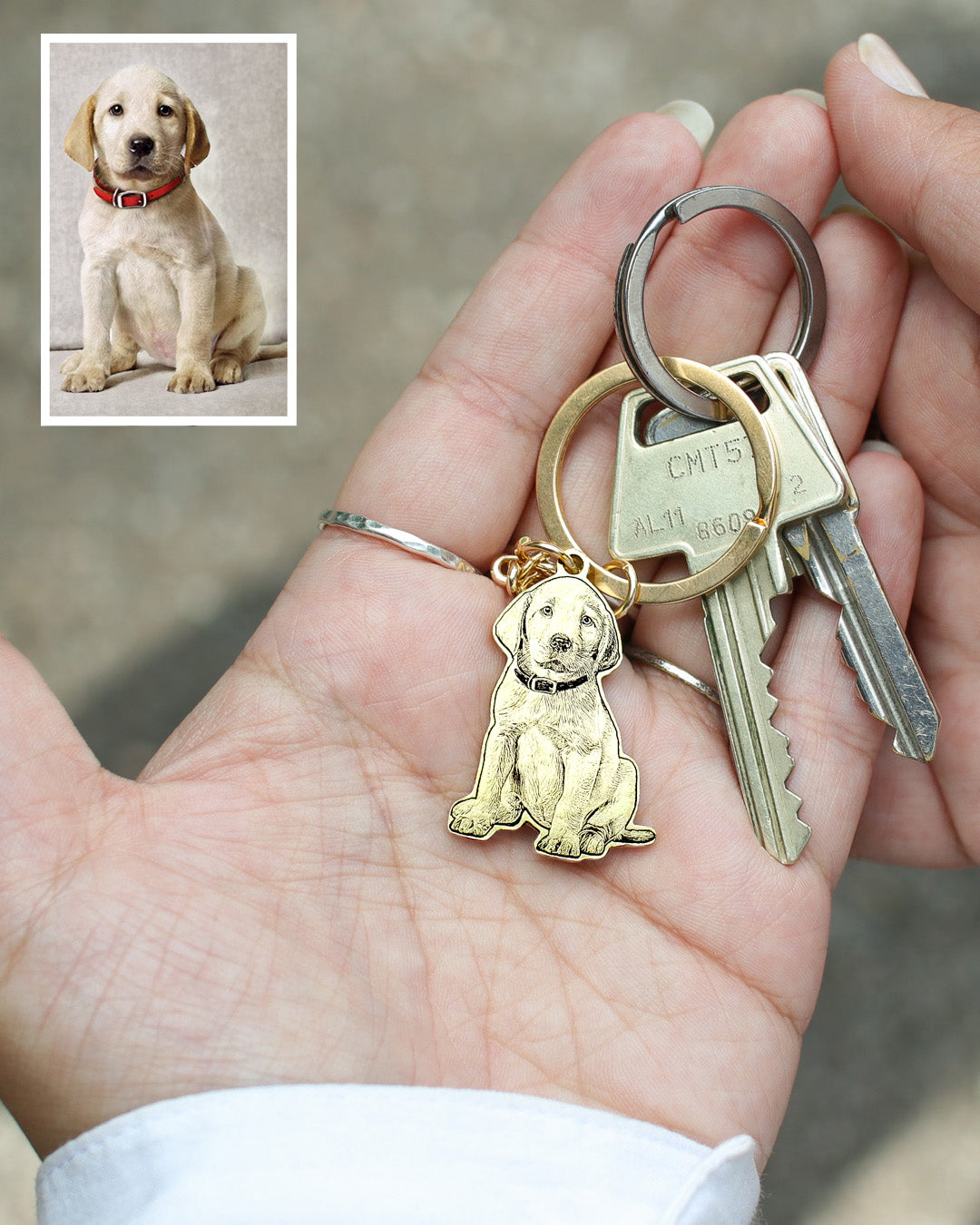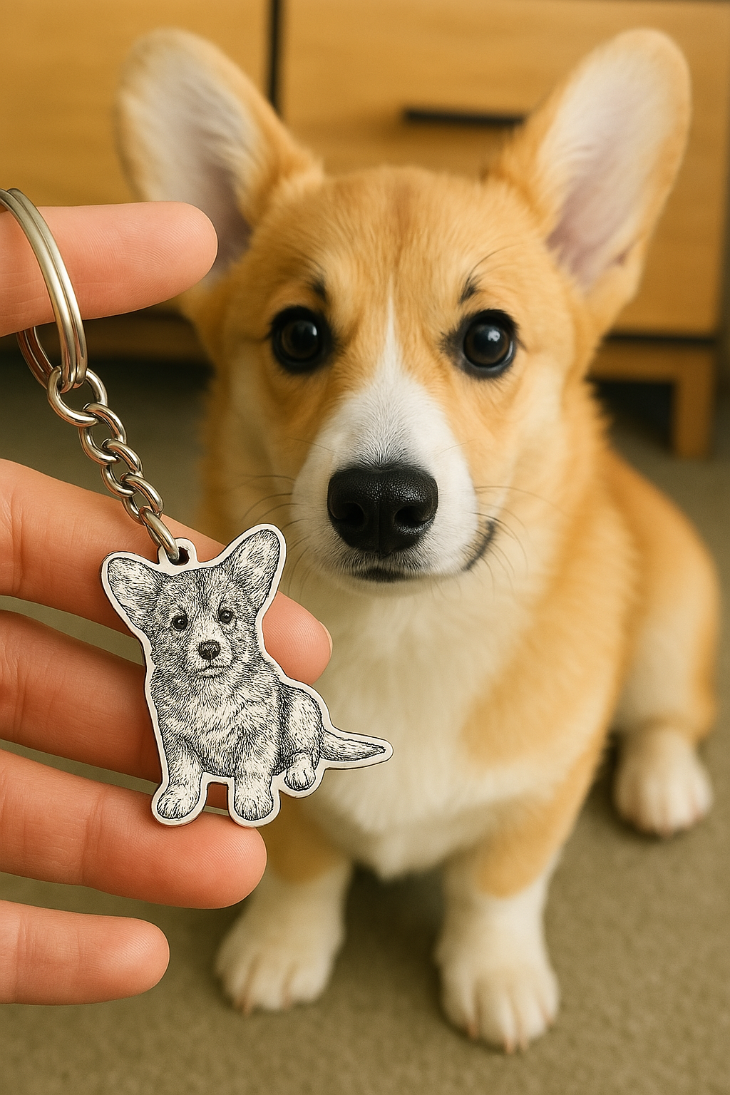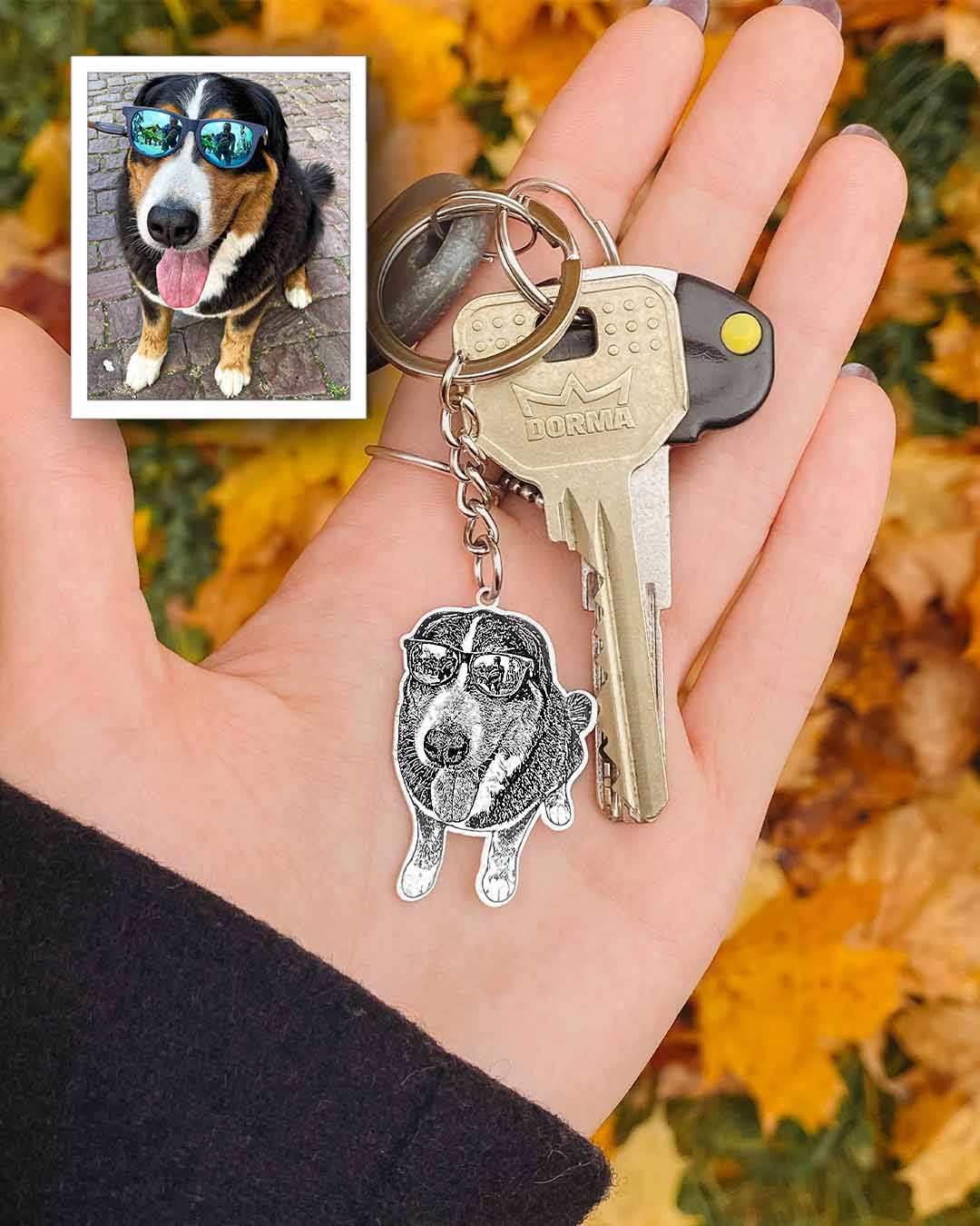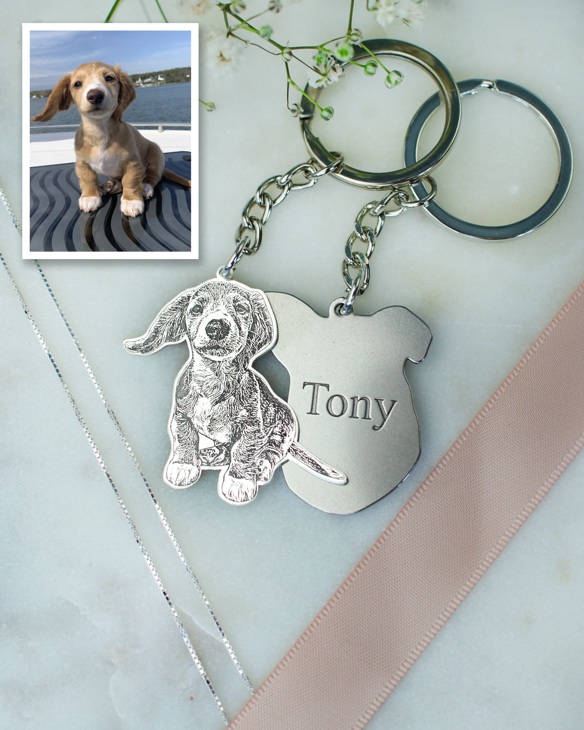 "I'm over the moon with my new personalized dog keychain! It's been tough not seeing my dog's face every day.."
