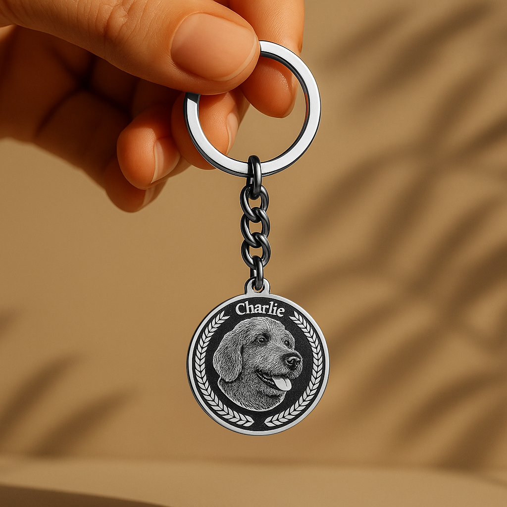 "I'm over the moon with my new personalized dog keychain! It's been tough not seeing my dog's face every day.."